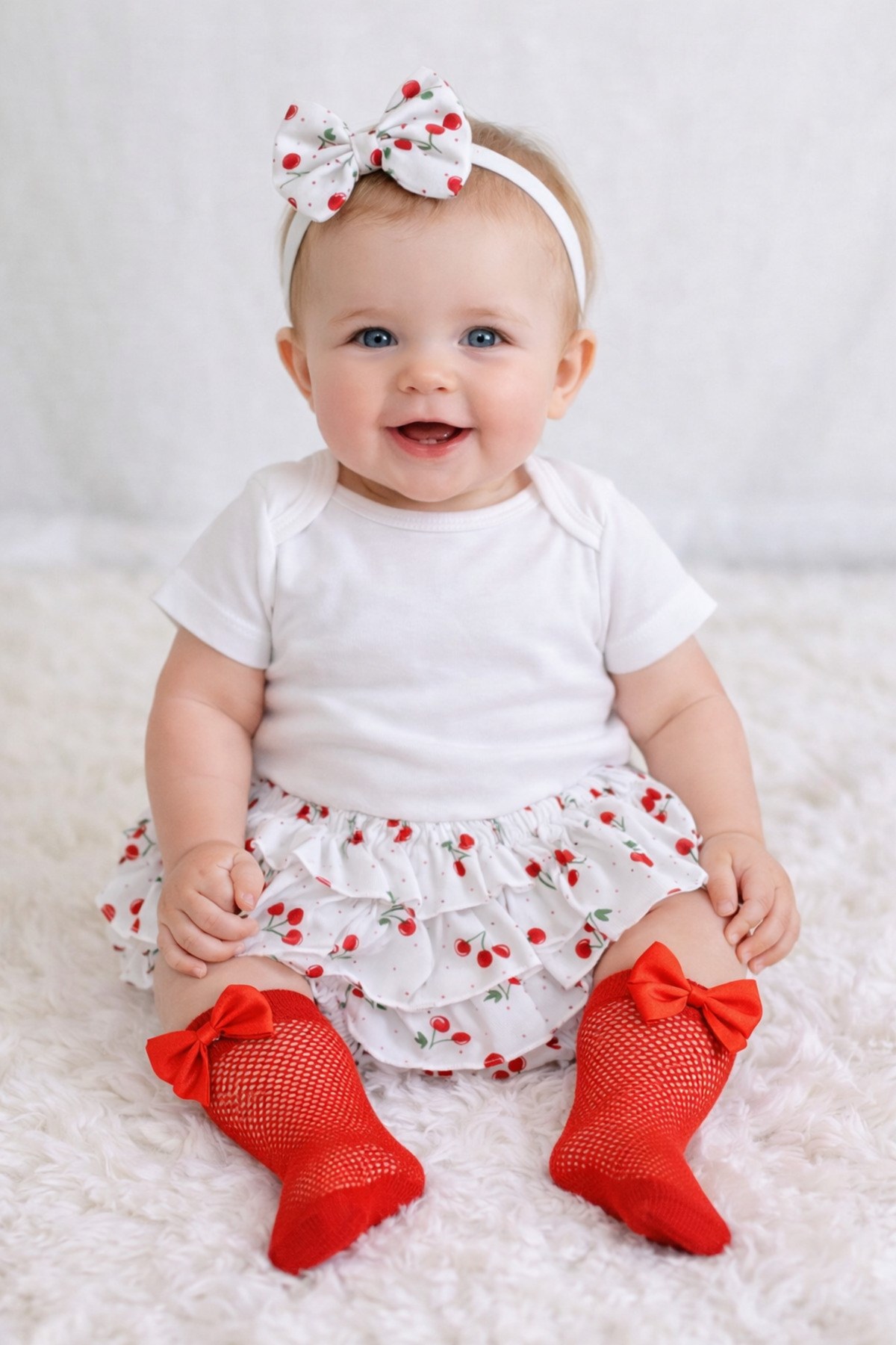 Kiraz Desenli Fırfırlı Şort Body Ve Kırmızı Fiyonk File Çoraplı