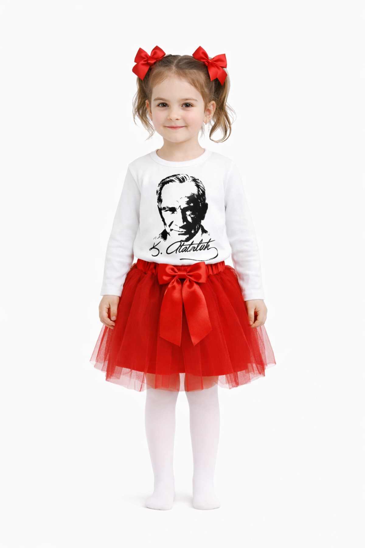 Kırmızı Tütü Etek Çorap Ve Toka Beyaz Tişört Atatürk Desenli Kız Çocuk Takım