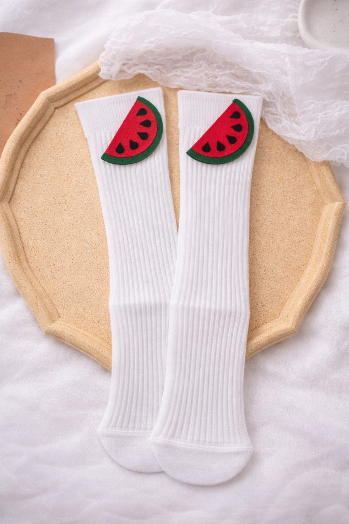 Kız Çocuk Beyaz Ribana Diz Altı Karpuz Keçeli Çorap