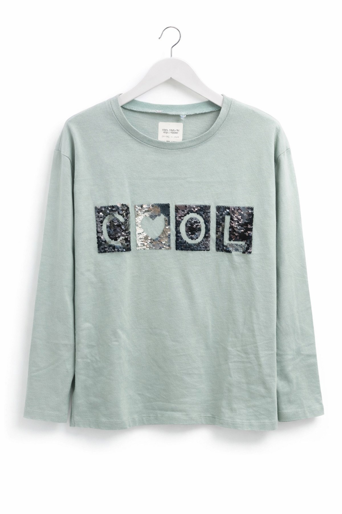 Kız Çocuk Mint Yeşili Payet Detaylı COOL Yazılı Uzun Kollu Tişört
