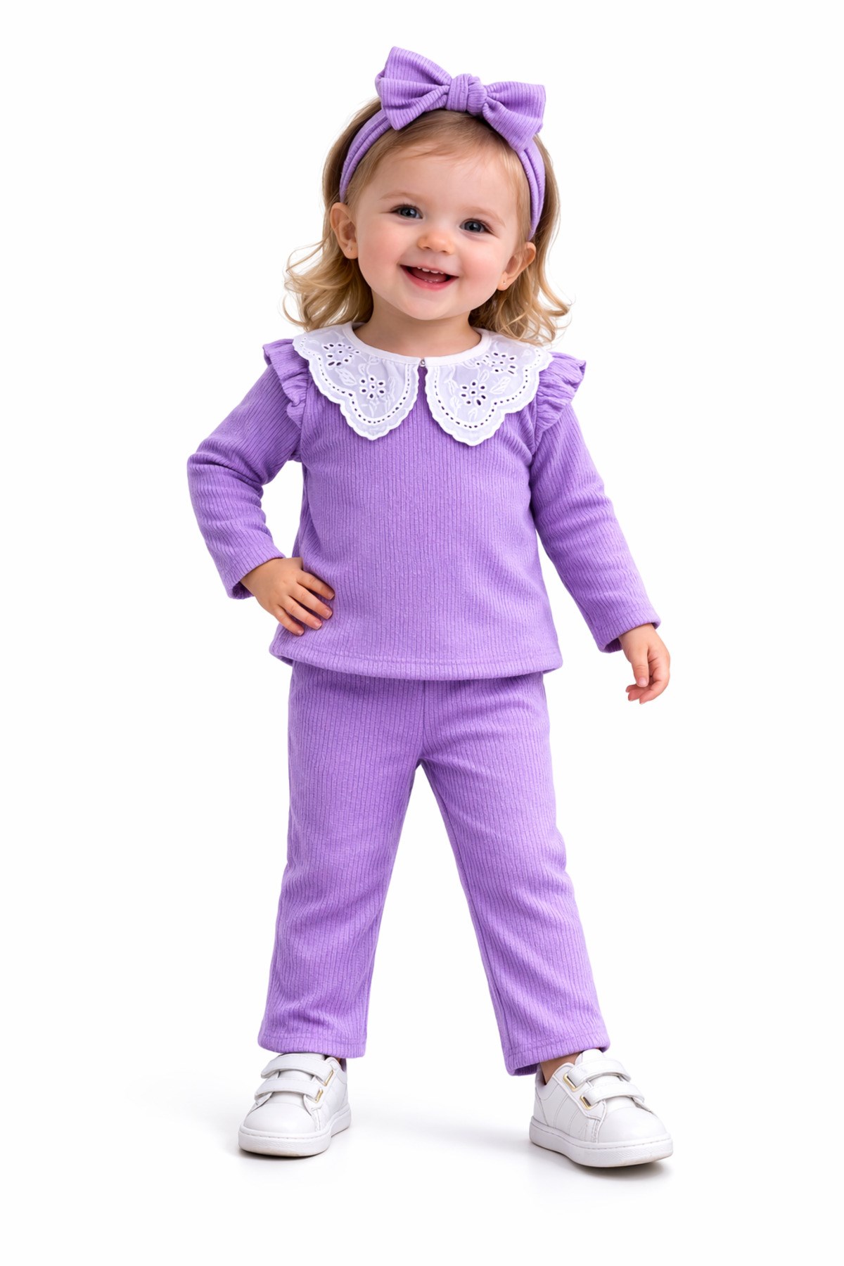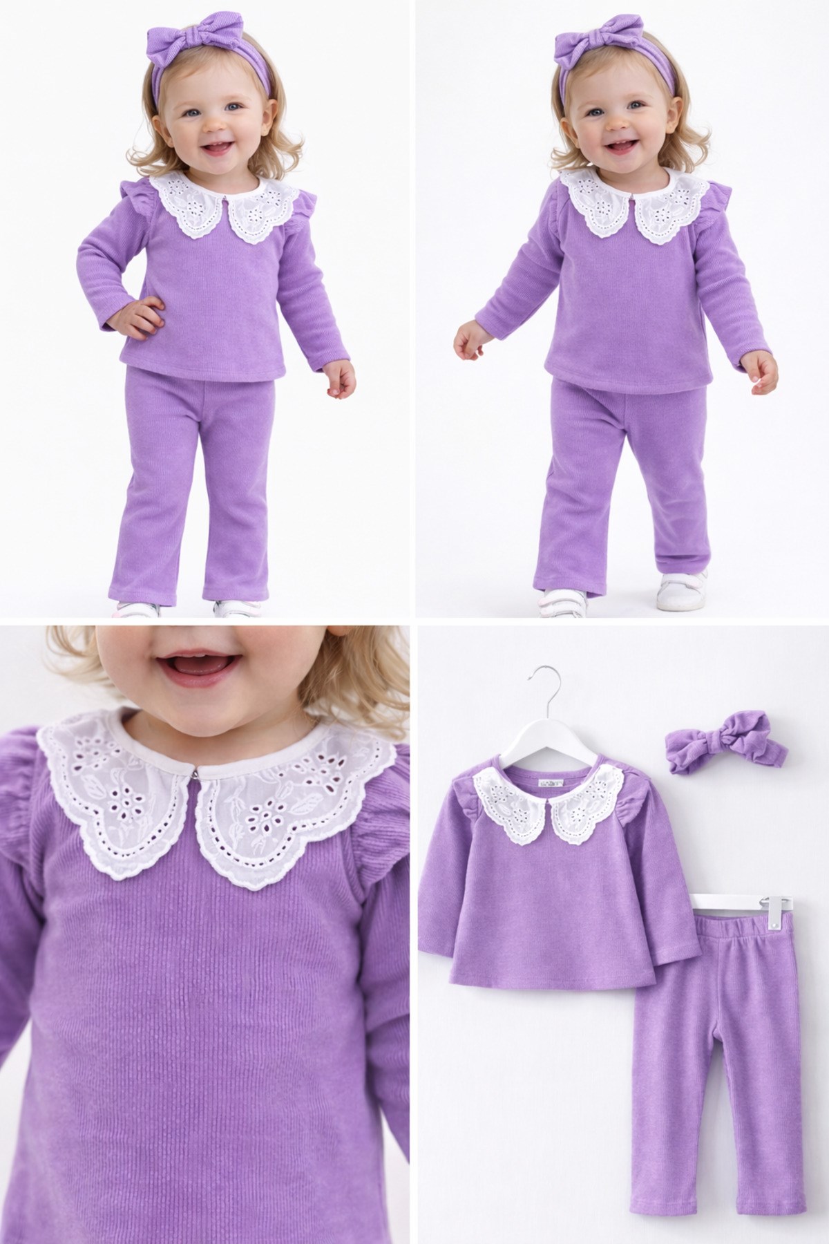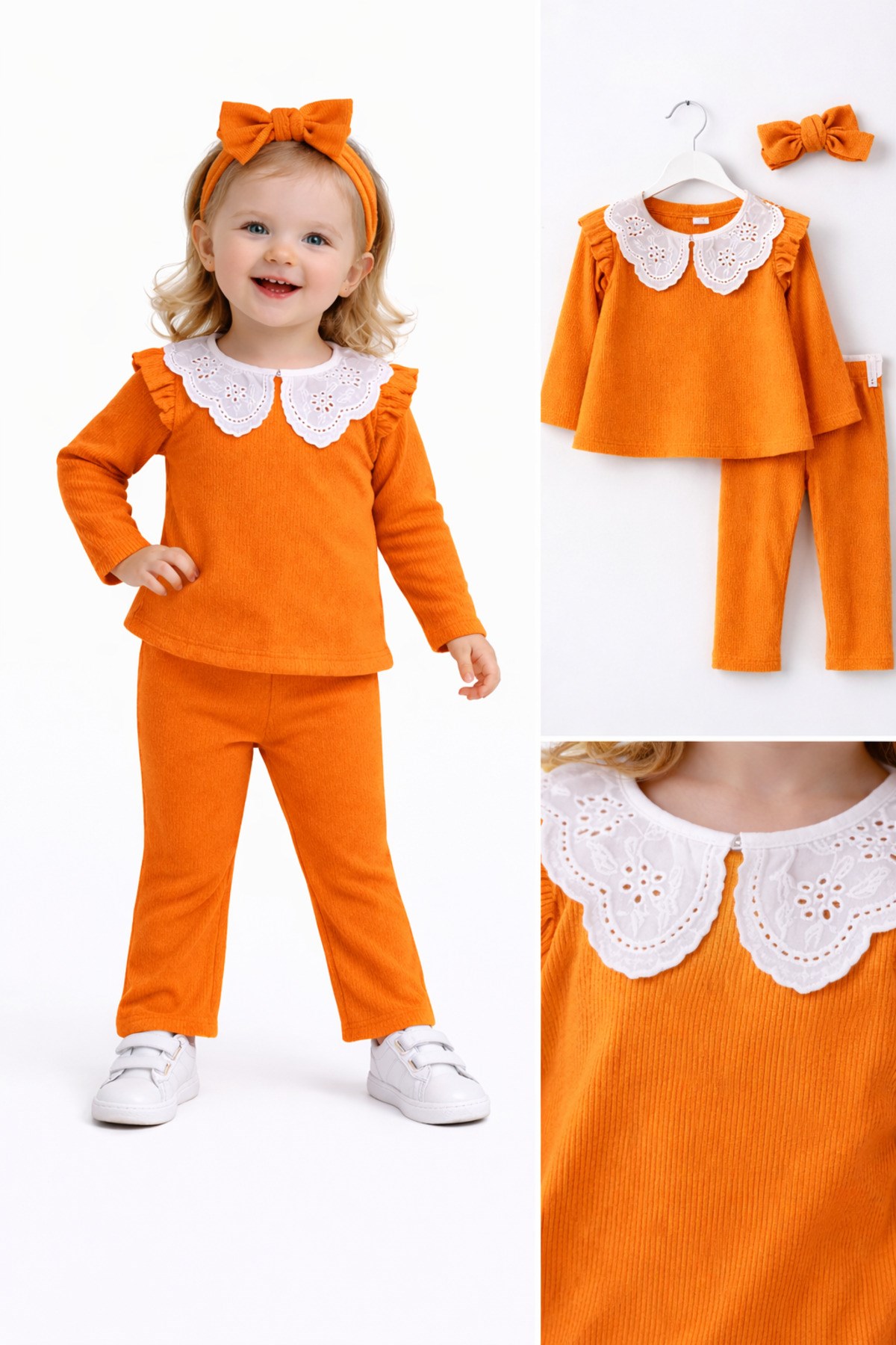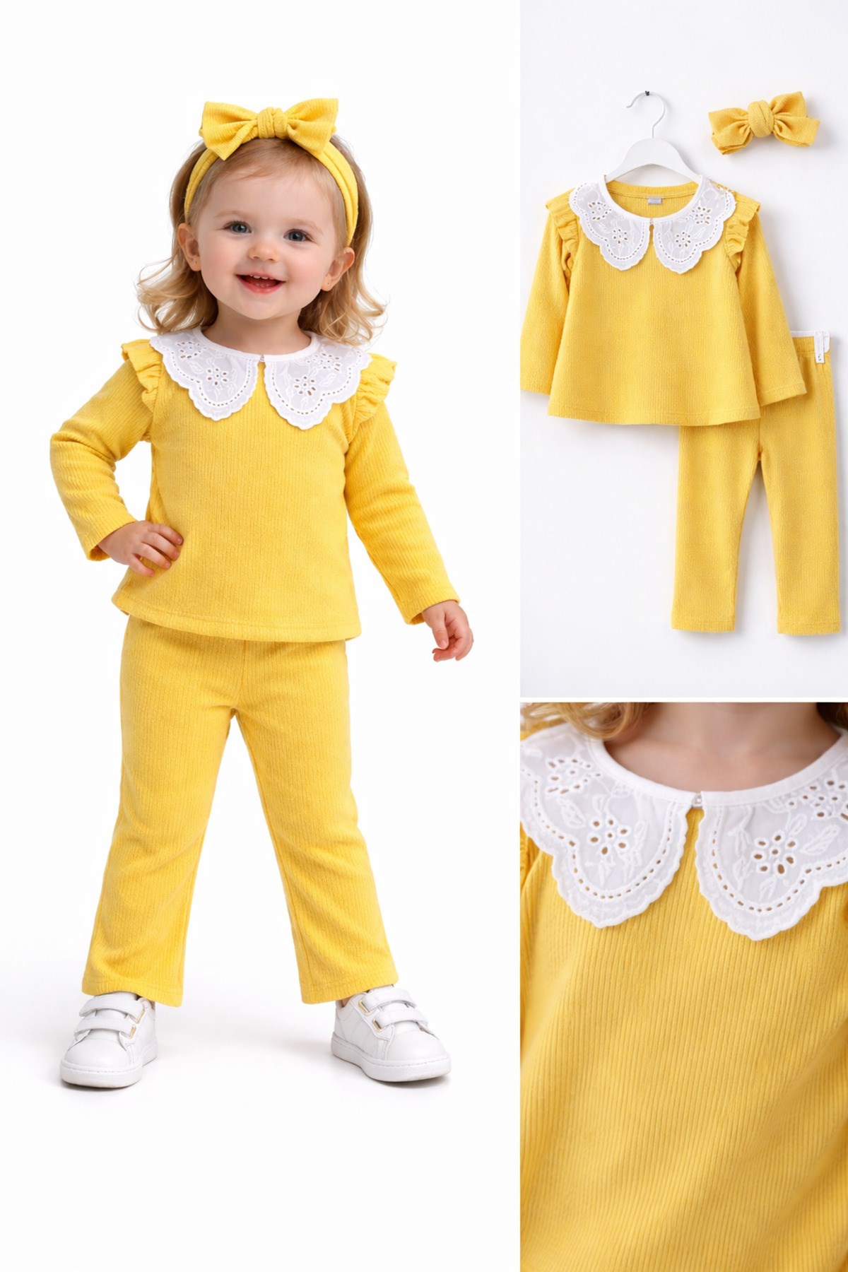 – Nar çiçeği desenli dantel yaka detayı ile şık ve zarif bir görünüm sunar.; – Kaşkorse ribana kumaşı, esnek yapısıyla rahat bir kullanım sağlar.; – Üç parçadan oluşan takım, günlük kullanım için idealdir.; – Kız çocukları için özel olarak tasarlanmıştır, onların tarzını yansıtır.; – Sürdürülebilir malzemelerden üretilmiştir, çevre dostudur.; – Çeşitli ortamlarda rahatlıkla giyilebilir, çok yönlüdür.; – Yaka tipi, klasik ve zamansız bir dokunuş katmaktadır.; – Kol boyu, hareket özgürlüğünü kısıtlamadan konfor sağlar.; – Paça tipi, modern ve şık bir siluet oluşturur.; – Yaş grubuna uygun olarak tasarlanmıştır, çocukların gelişimine uygunluk gösterir.; – Materyal bilgisi, ürünün kalitesini ve dayanıklılığını vurgular.; – Boy uzunluğu, farklı vücut tiplerine uyum sağlayacak şekilde ayarlanabilir.; – Desen detayları, takımın estetik görünümünü zenginleştirir.; – Cinsiyet ayrımı gözetmeksizin her çocuğun rahatlıkla tercih edebileceği bir tasarıma sahiptir.; – Menşei bilgisi, ürünün üretim kalitesini ve standartlarını belirtir.; – Kumaş tipi, ürünün nefes alabilirliği ve konforunu artırır.; – Kalıp bilgisi, ürünün vücuda oturma şeklini ve rahatlığını tanımlar.;