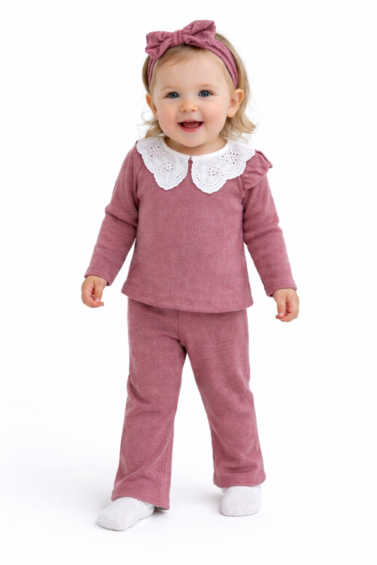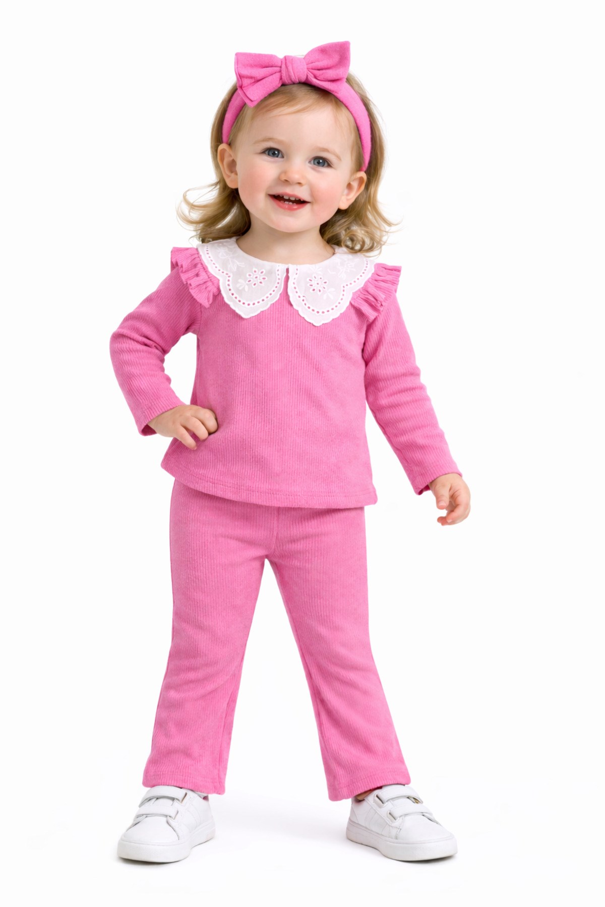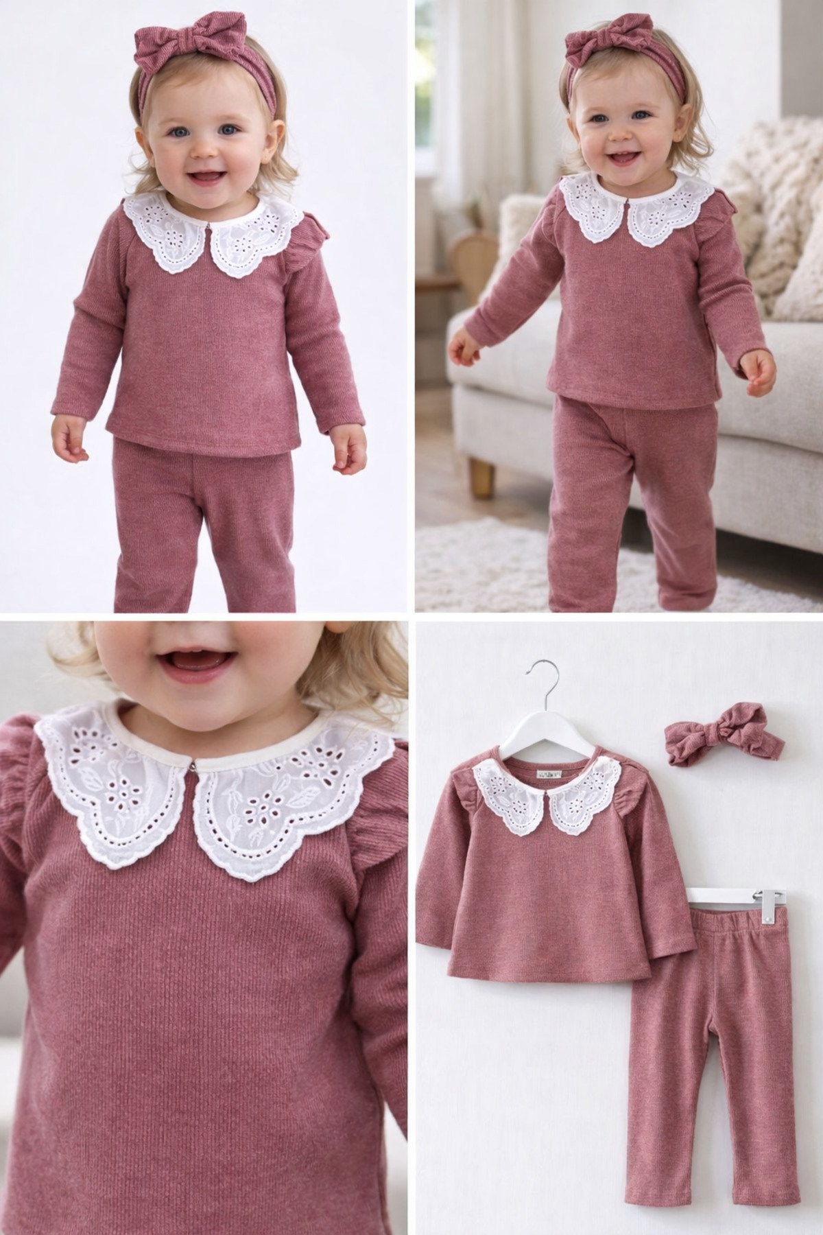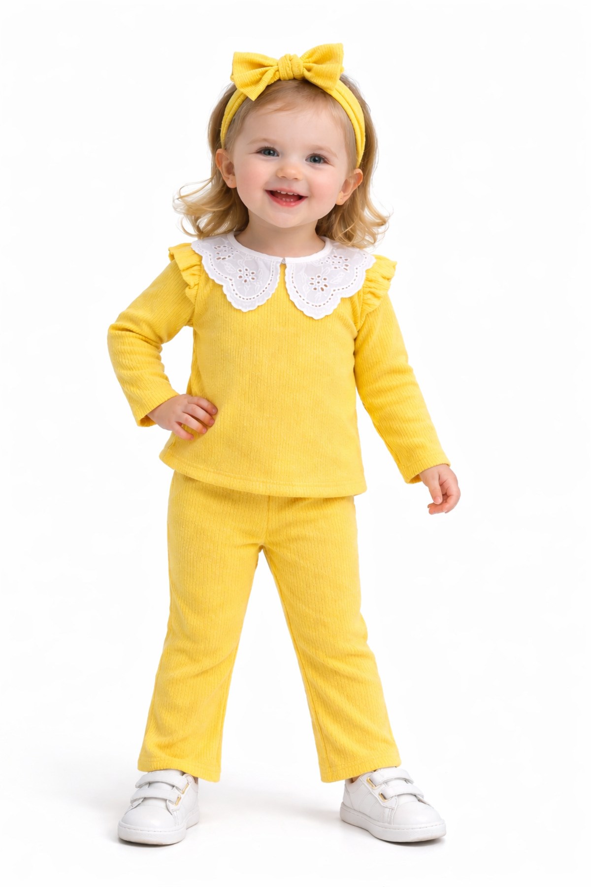 – Nar çiçeği desenli dantel yaka detayı ile şık ve zarif bir görünüm sunar.; – Kaşkorse ribana kumaşı, esnek yapısıyla rahat bir kullanım sağlar.; – Üç parçadan oluşan takım, günlük kullanım için idealdir.; – Kız çocukları için özel olarak tasarlanmıştır, onların tarzını yansıtır.; – Sürdürülebilir malzemelerden üretilmiştir, çevre dostudur.; – Çeşitli ortamlarda rahatlıkla giyilebilir, çok yönlüdür.; – Yaka tipi, klasik ve zamansız bir dokunuş katmaktadır.; – Kol boyu, hareket özgürlüğünü kısıtlamadan konfor sağlar.; – Paça tipi, modern ve şık bir siluet oluşturur.; – Yaş grubuna uygun olarak tasarlanmıştır, çocukların gelişimine uygunluk gösterir.; – Materyal bilgisi, ürünün kalitesini ve dayanıklılığını vurgular.; – Boy uzunluğu, farklı vücut tiplerine uyum sağlayacak şekilde ayarlanabilir.; – Desen detayları, takımın estetik görünümünü zenginleştirir.; – Cinsiyet ayrımı gözetmeksizin her çocuğun rahatlıkla tercih edebileceği bir tasarıma sahiptir.; – Menşei bilgisi, ürünün üretim kalitesini ve standartlarını belirtir.; – Kumaş tipi, ürünün nefes alabilirliği ve konforunu artırır.; – Kalıp bilgisi, ürünün vücuda oturma şeklini ve rahatlığını tanımlar.;