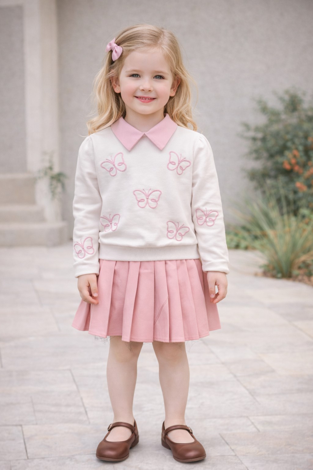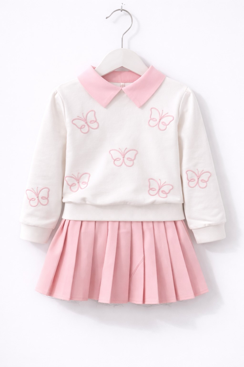 Pembe Kelebek Nakışlı Kız Çocuk Etekli Takım