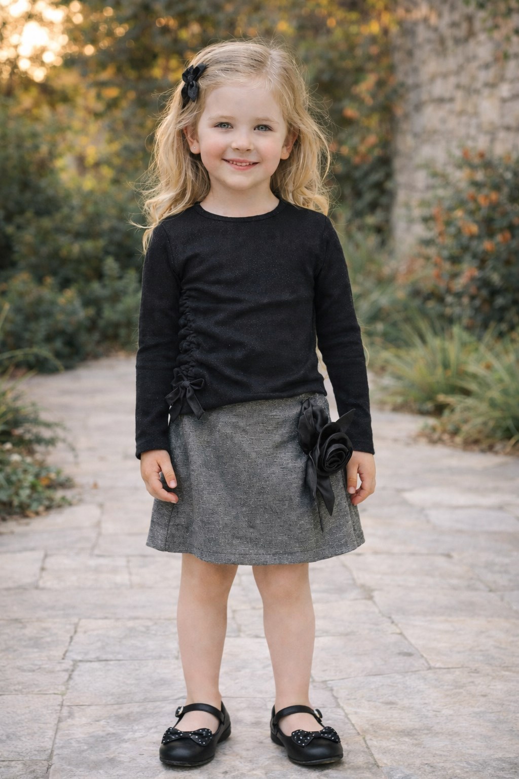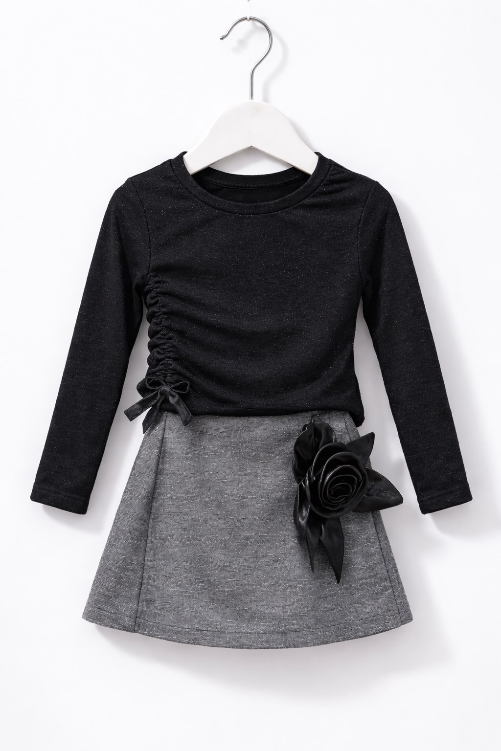 Siyah Gül Detaylı Kız Çocuk Etekli Takım