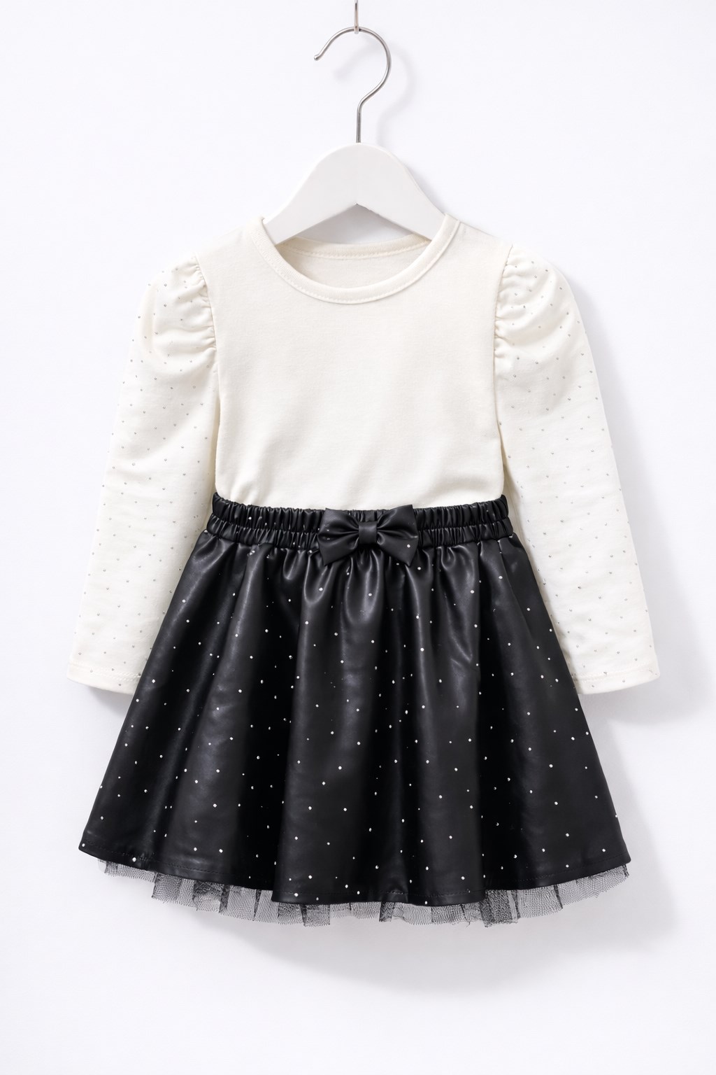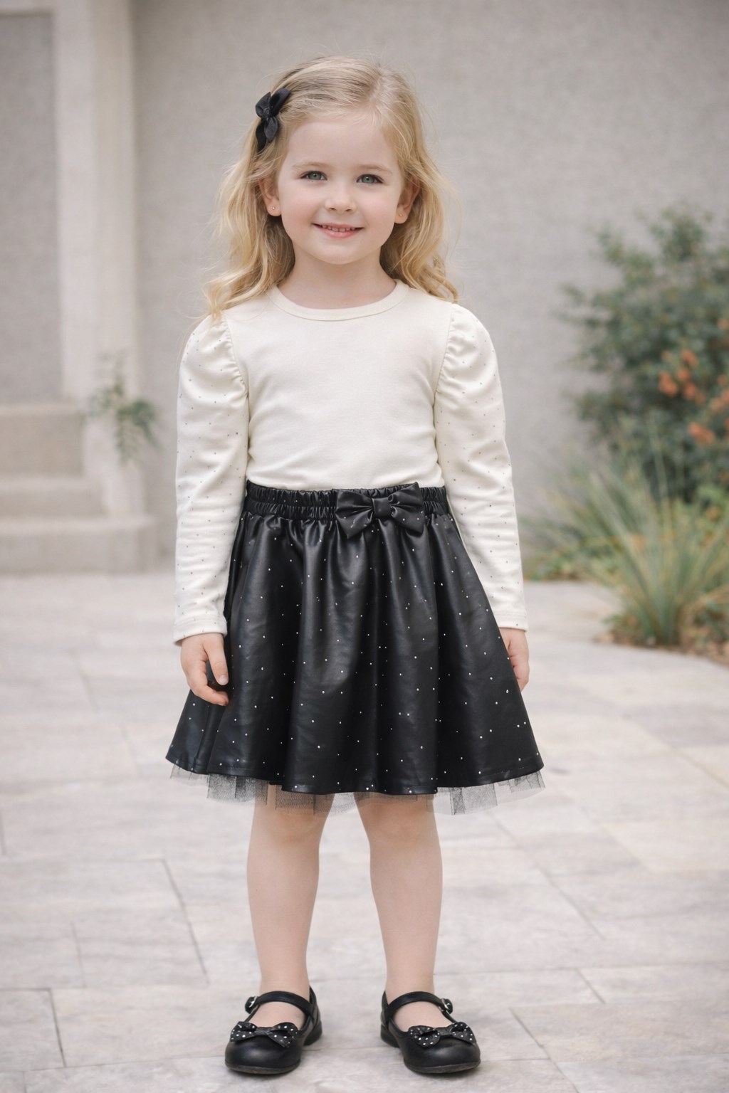 Taş Detaylı Siyah Deri Etekli Kız Çocuk Takım