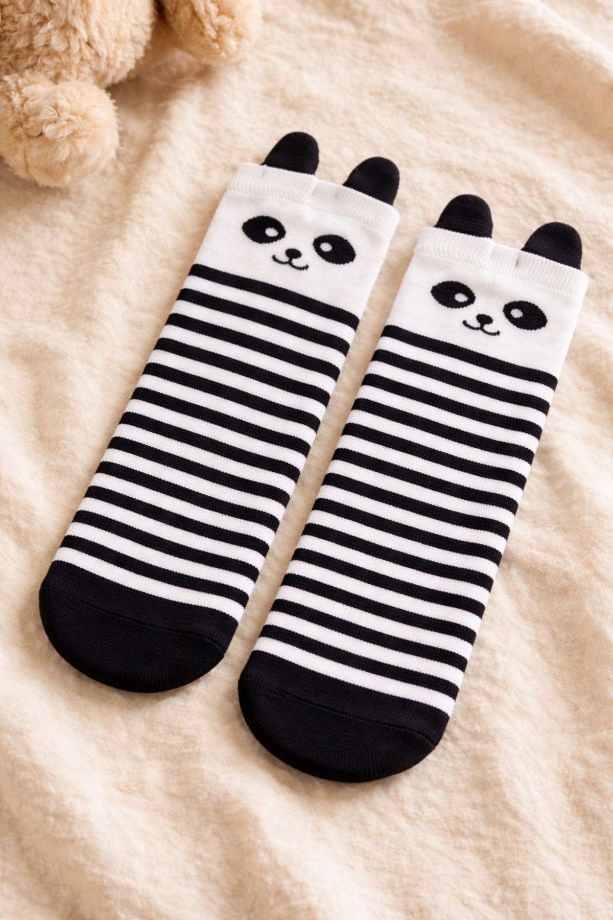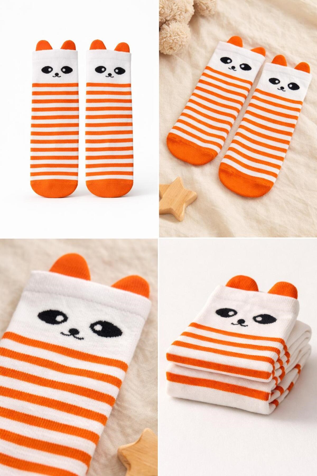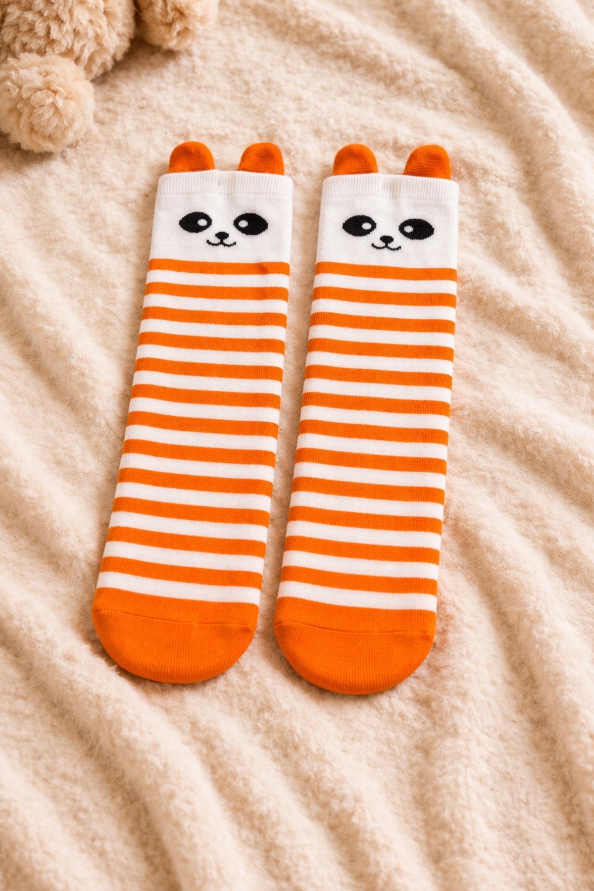 Turuncu Çizgili Panda Desenli Diz Altı Çorap
